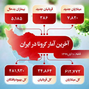 ایرج حریرچی، مدیر کل وزارت بهداشت از جمله کسانی است که، میزان جان باختگان کرونا را دو برابر و نیم آمارهای دولتی دانسته است. حسین قشلاقی، عضو شورای عالی نظام پزشکی کشور نیز، از جمله افرادی است که آمار واقعی جانباختگان و مبتلایان را، چهار برابر آمارهای رسمی اعلام کرده است. میزان فاجعه بار کشته شدگان ویروس کرونا که این روزها به رقم بالایی رسیده است، البته در روز چهارشنبه هفتم آبان ماه ۹۹ متوقف نشد. این روند، در روز پنج شنبه هشتم آبان، با جان باختن ۳۹۹ نفر و تعداد ۸ هزار و ۲۹۳ مبتلای جدید تکرار شد. فاجعه ای که در روز شنبه دهم آبان با ۳۸۶ جان باخته و ۷ هزار و ۸۲۰ ابتلای جدید تداوم یافت و در روز یکشنبه ۱۱ آبان، با جان باختن ۴۳۴ نفر طی یک شبانه روز با رکوردی تازه به بالاترین میزان کشتار روزانه تا به امروز رسیده است. در این میان، وضعیت تهران به لحاظ میزان مرگ و میر و رکورد شکنی بسیار فاجعه بارتر از دیگر مناطق کشور گزارش شده است. طی هفته های اخیر، وضعیت تهران آن چنان فاجعه بار بوده است که علیرضا زالی، فرمانده عملیات مقابله با بیماری کرونا در تهران، به تاریخ هفتم آبان ماه جاری اعلام کرد، در یک ماه گذشته شاهد رکوردزنی ۹ باره در تهران بوده ایم و در روزهای اخیر، برای پنجمین روز متوالی، عدد بستری شدگان کرونایی از ۶ هزار نفر پایین تر نیامده است.