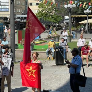 روز شنبه ۲۴ ژوئن برابر با ۲ مرداد نیروهای چپ و کمونیست در خیابان مدبوریا پلاتزن استکهلم در حمایت از مردم انقلابی و مبارز خوزستان و دیگر استانهای ایران دست به یک تجمع اعتراضی زدند که در این تجمع فعالین سازمان فدائیان اقلیت حضور چشمگیری داشتند. در جریان این تجمع فعالینی از سازمانها و احزاب مختلف و همچنین یکی از فعالین سازمان فدائیان اقلیت در حمایت از مردم بپا خاسته و جنبش کارگری ایران به ایراد سخنرانی پرداختند. درحالیکه شعار مرگ بر جمهوری اسلامی و جمهوری اسلامی نابود باید گردد بارها در این تجمع طنینانداز شد اما حاضرین سعی کردند با سردادن شعارهایی به زبان سوئدی مردم شهر استکهلم را در جریان ستمگری جمهوری اسلامی و حوادث رخداده در خوزستان قرار دهند. پس از پایان سخنرانیها، شرکتکنندگان در این تجمع از خیابان مدبوریا پلاتزن تا سلوسن دست به تظاهرات زدند و در طول این مسیر از حمایت مردم بومی شهر استکهلم برخوردار شدند. این تجمع اعتراضی که از ساعت ۱۲ بعدازظهر شروعشده بود ساعت ۲ بعدازظهر به پایان رسید.