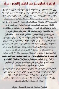 خاطرنشان میشود که یکی از سخنرانان در سالن هوسبی ترف و در مراسمی که کانون زندانیان سیاسی برگزار میکند، توکل از سازمان فدائیان(اقلیت) خواهند بود. روز ۱۶ سپتامبر برابر با ۲۵ شهریور به خیابانها بیائیم.