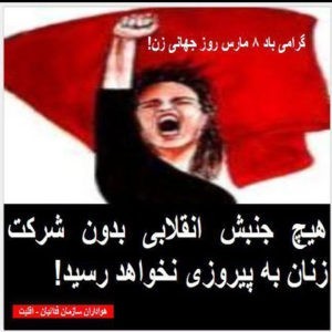 ما فعالین و هواداران سازمان فدائیان اقلیت – داخل کشور ۸ مارس روز جهانی زن را به تمام زنان زحمتکش و ستمدیده و به همه مردانی که برای الغاء ستم و تبعیض جنسیتی تلاش و مبارزه می کنند تبریک می گوییم و عموم زنان، کارگران و زحمتکشان را به تشدید مبارزه برای سرنگونی هر چه فوری تر رژیم جمهوری اسلامی و استقرار یک حکومت شورایی فرا می خوانیم .